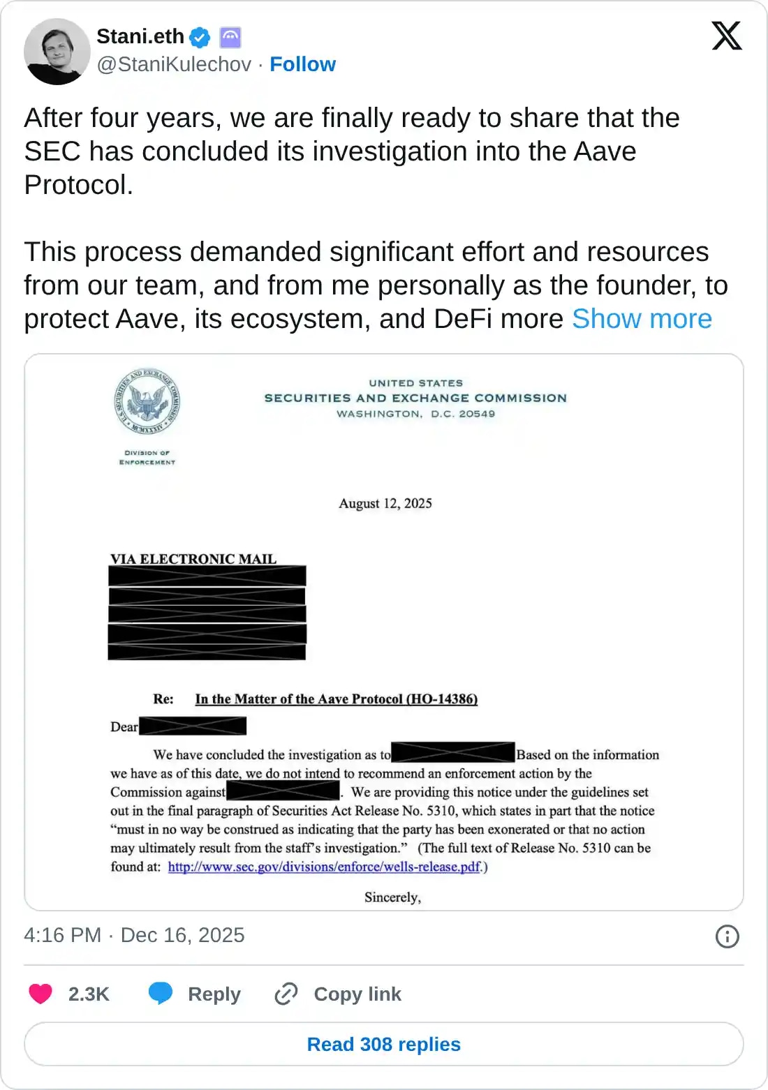 周二,Aave协议创始人兼首席执行官StaniKulechov在其X账户上发布了一则重磅消息:SEC已正式结束对Aave协议长达四年的调查。这一消息本应给持续低迷的市场注入一剂强心针,毕竟在DeFi领域普遍面临监管不确定性的当下,长达四年的调查悬而未决一直是压制AAVE估值的重要因素。Kulechov在声明中难掩激动:“近年来,DeFi面临着不公平的监管压力。我们很高兴能够摆脱这种困境,进入一个开发者可以真正构建金融未来的新时代。”