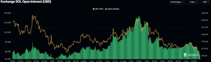 1.未平仓合约(OI)大幅下滑。根据Coinglass提供的数据显示,周五SOL期货未平仓合约跌至50亿美元,这一数值创下了2025年4月中旬以来的最低纪录。要知道,在2026年1月中旬,SOL未平仓合约曾一度攀升至近90亿美元的高点,而此后便持续回落,如今近乎腰斩。未平仓合约的持续下降,本质上反映出投资者参与度的不断降低,市场活跃度下滑,进一步强化了看跌预期。