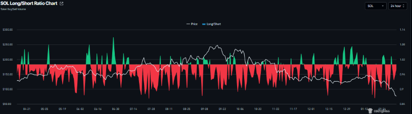 2.多空比跌破平衡线,空头占据上风。同样来自CoinGlass的数据显示,周五SOL的多空比仅为0.96,这一比率低于1的平衡线,意味着市场中看跌的交易者数量超过看涨者,更多投资者选择押注SOL价格继续下跌,看跌情绪已然成为市场主流。