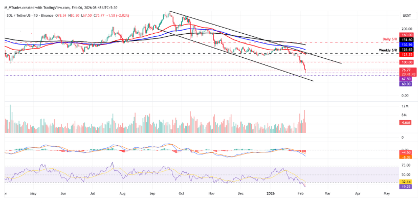回溯近期走势,SOL价格在1月28日触及126.65美元的周线阻力位后,便陷入持续下跌的泥潭,未能实现突破。截至本周二,SOL单周跌幅已超21%,直接跌破100美元这一关键心理关口——这一关口的失守,成为了抛售潮加剧的导火索,此后SOL价格一路下行,截至周五盘中,最低触及67.50美元,距离前期高点已缩水近一半。