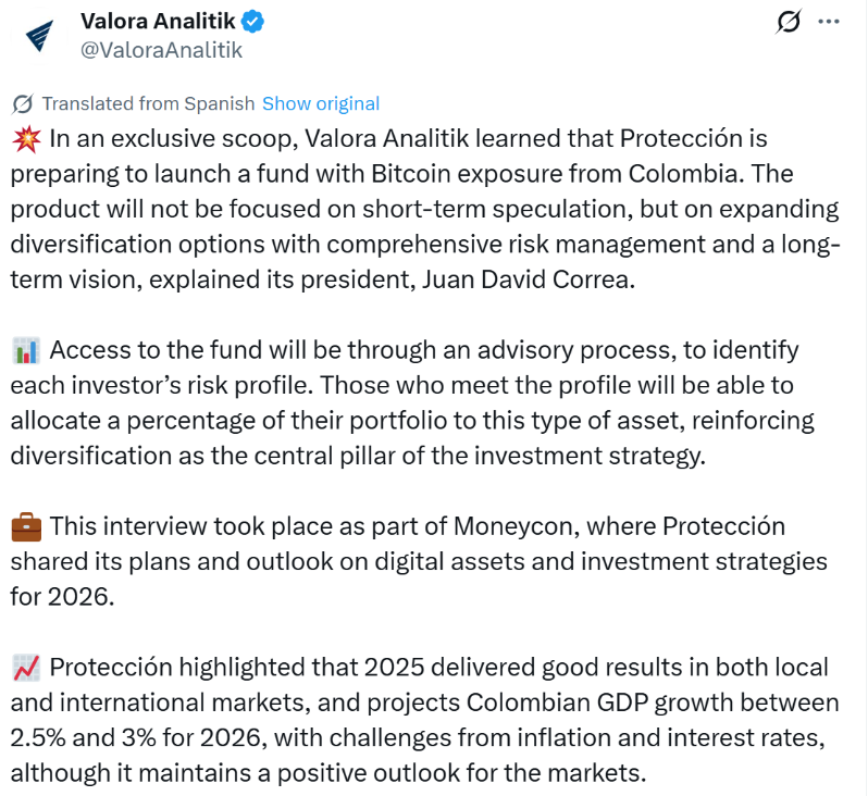 该公司总裁Juan David Correa在接受当地媒体采访时表示,这只基金将仅面向符合特定条件的客户开放,并通过个性化顾问流程评估投资者的风险承受能力。符合条件的投资者可自愿选择将投资组合中的一部分配置到比特币。