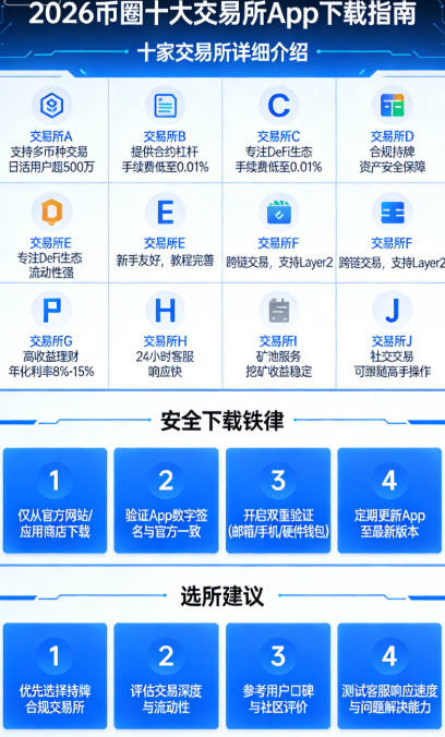 想踏入币圈,第一步就是选对交易所、下对App!选错平台、下错安装包,轻则资产缩水、交易受阻,重则血本无归、遭遇诈骗,多少新手因为找不对正规入口,刚入局就踩坑离场,多少老玩家因为平台不合规,辛苦积累的收益付诸东流。2026年全球币圈格局已更新,十大权威交易所榜单正式出炉,覆盖全球超90%加密货币交易量,从全球龙头到合规新秀、从合约大神聚集地到山寨币挖掘天堂,从新手友好型到专业进阶型,一次性全整理、全解析。官方下载地址+安全验证方法+核心优势+专属福利,一篇讲透所有关键信息,让你告别钓鱼网站、避开虚假App,安全上车、安心交易,轻松把握2026年币圈新机遇!