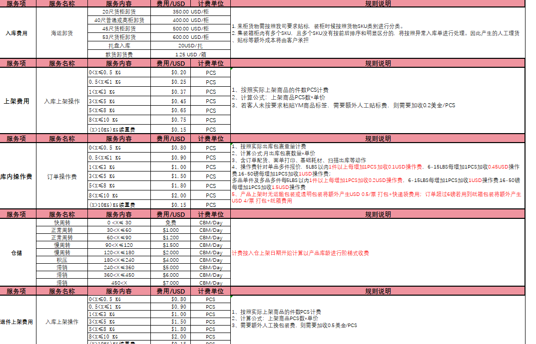 时间周期:通常按月收费,部分仓库按天计费(如淡季0.5-1.5美元/立方英尺/月,旺季可能涨价)。