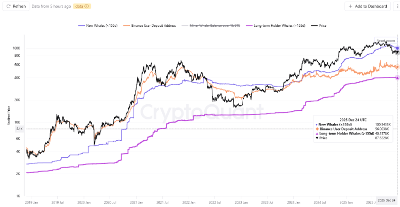 新晋巨鲸(持有代币不足155天的大型投资者)正处于盈亏临界点。数据显示,这类近期入场的大玩家平均成本集中在100,500美元左右,这意味着当前87,000美元上下的价格,让他们普遍处于浮亏状态。10万美元因此成为关键关口:若价格能回升至该区间附近,新晋巨鲸可能为保护资本而主动护盘,若市场信心恢复,这里也可能成为新一轮资本积累的起点;反之,若价格持续低于成本线,可能引发被动抛售,加剧下行压力。