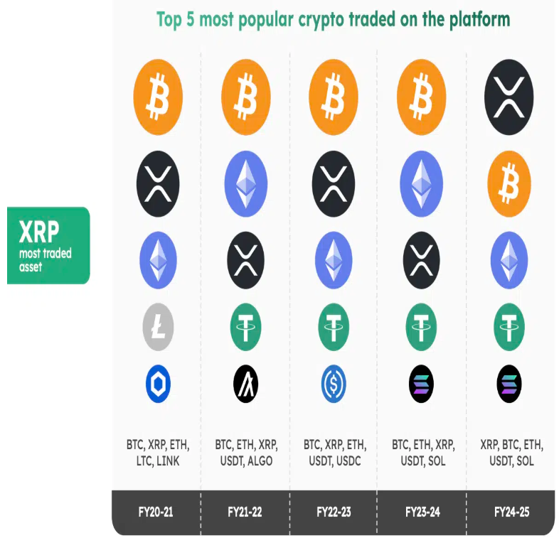 2024-2025财年,BTCMarkets上交易量排前五的加密货币是:XRP、比特币、以太坊、泰达币、Solana。值得一提的是,USDC掉出了前五,说明投资者不想再守着保本的资产,更愿意买那些看起来上涨空间大、或者网络活跃度高的代币。