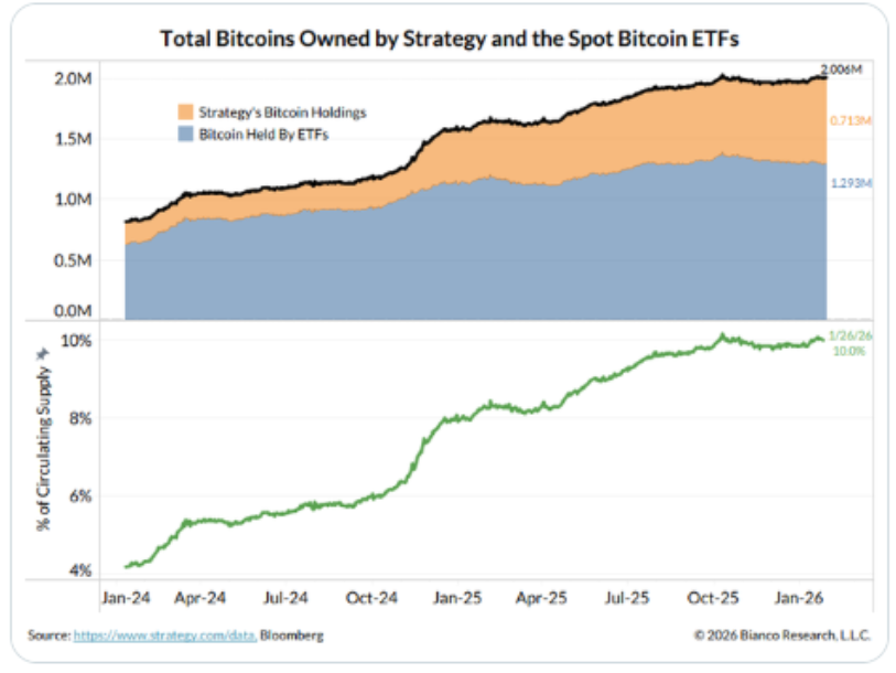 关键问题出在市场结构上:现在的比特币市场,早已不是散户说了算,而是被机构牢牢掌控。JimBianco的分析显示,比特币市场呈现高度机构化特征,其中比特币现货ETF的投资者,再加上“比特币死多头”MicroStrategy,两者合计控制了约10%的比特币流通量。这是什么概念?相当于市面上每10枚比特币,就有1枚被这些机构攥在手里,它们的一举一动,直接决定了比特币的价格走向。